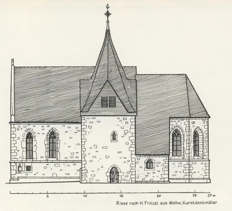 Nach Fertigstellung der Kirche, jedoch noch in der 1. Hälfte des 16. Jhs., entstand die Sakristei. Gleichzeitig baute man vermutlich die drei mauerbündigen Fenster im Schiff ein, die gegenüber denen mit innerer und äußerer Laibung auffallen. Der Turm ist älter als die Kirche, denn in seiner Ostseite, zur Sakristei hin, sitzt ein kleines, rundbogiges romanisches Fenster. Ein romanischer Kämpfer, als Rest einer romanischen Kirche, findet sich im Turmmauerwerk am Anschluss zum Chor.