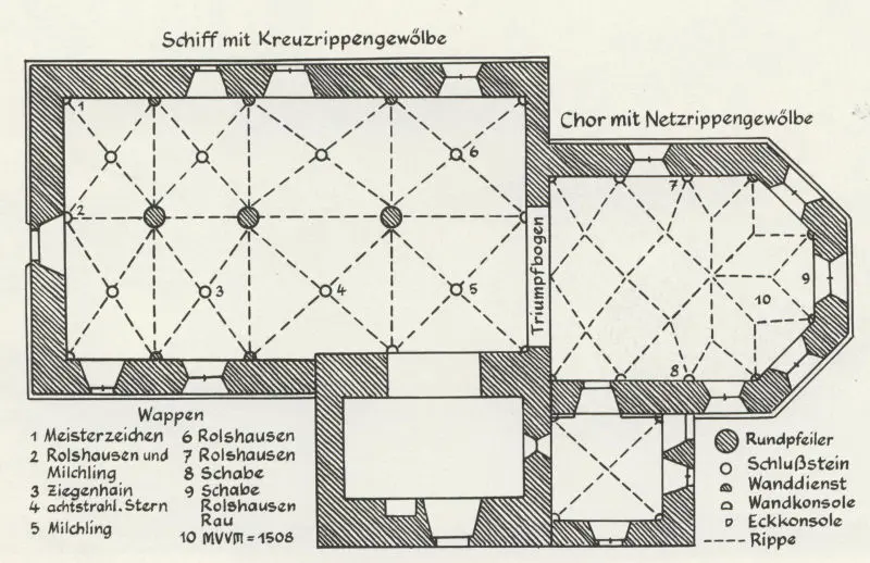 Acht unterschiedlich große Kreuzrippengewölbe stützen sich auf drei in einer Reihe außermittig stehende Rundsäulen. Außer drei einfachen Kreuzungen hat das Gewölbe fünf schmucklose Schlusssteine und einen mit dem Ziegenhainer Stern. Dem etwas breiteren Südschiff ist der geräumige Chor ostwärts vorgesetzt. Er hat annähernd quadratischen Grundriss mit anschließendem 3/8-Chorschluß. Den Chor überspannt ein schönes Netzgewölbe, dessen Rippen auf 3/4-Diensten stehen. Bis 1637 stand die Kanzel an der Säule vor dem Chor. Wegen des Emporeneinbaus im Schiff bekam sie dann ihren Platz am Chorbogen.